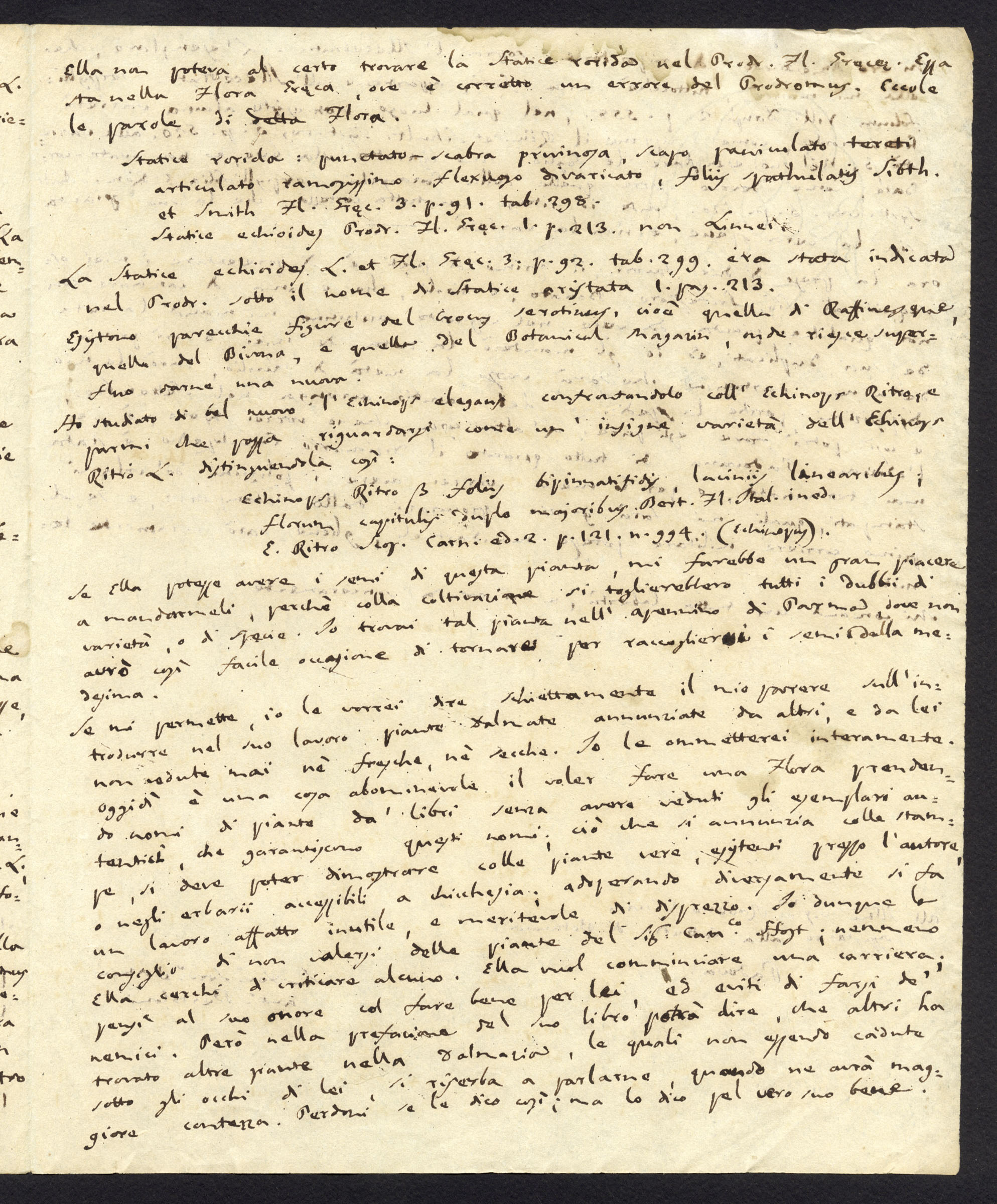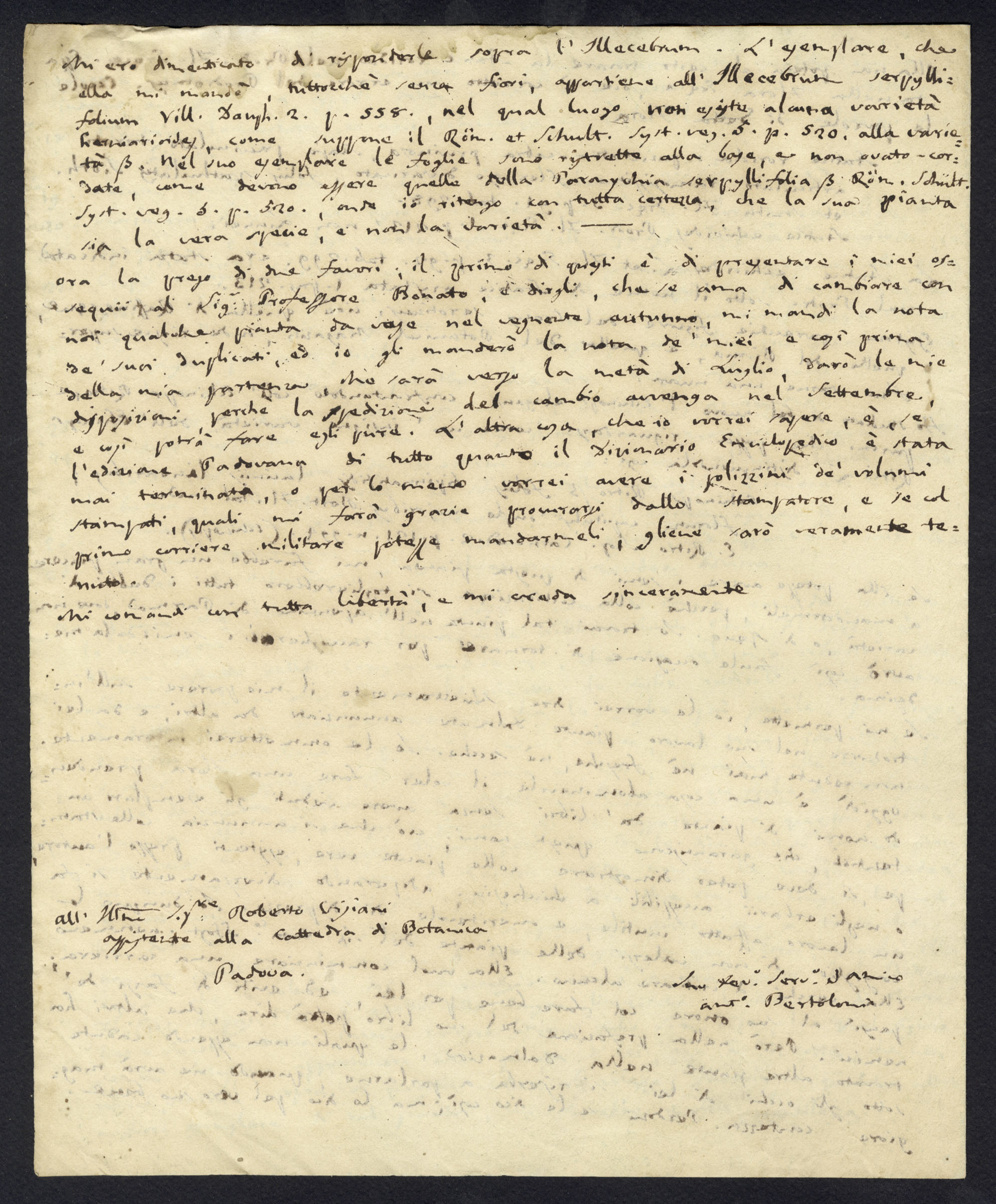 A partire da Padova De Visiani fu in grado di intrattenere importanti corrispondenze scientifiche con i maggiori studiosi, botanici, intellettuali e letterati a lui contemporanei, come il botanico Antonio Bertoloni, autore dell'opera in dieci volumi intitolata Flora italica e pubblicata tra il 1833 e il 1854. Bertoloni ha documentato per la prima volta la flora spontanea di tutto il territorio nazionale non ancora unificato. Come testimoniato da numerose lettere, oggi custodite nell'archivio dell'Orto botanico di Padova, De Visiani ha scambiato con il Bertoloni varie piante, anche della Dalmazia, e ha ricevuto preziosi consigli per il suo magistrale lavoro di ricerca floristica pubblicato in tre volumi nel 1842, 1847 e 1852, e denominato Flora Dalmatica. In una lettera datata 21 giugno 1825, Bertoloni, veterano della ricerca botanica, mette in guardia il giovane De Visiani dall'introdurre piante dalmate "annunziate da altri e da lei non vedute mai né fresche, né secche", ben rappresentando il metodo di lavoro condotto sul campo della ricerca botanica ottocentesca. E continua: "Io le ometterei interamente. Oggidì è una cosa abominevole il voler fare una Flora prendendo nomi di piante da libri senza avere davanti gli esemplari autentici, che garantiscano questi nomi; ciò che si annunzia colle stampe, si deve poter dimostrare colle piante vere, esistenti presso l'autore, o negli erbarii accessibili a chicchesia".