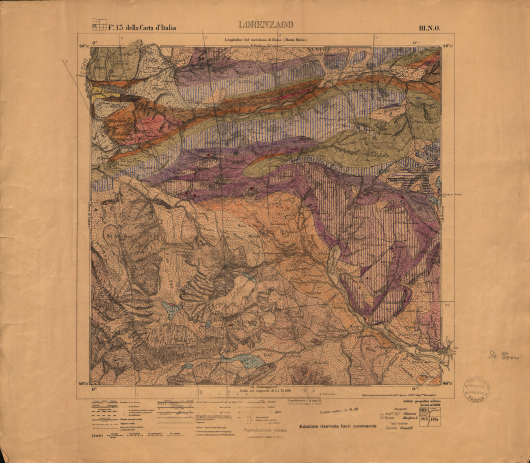 Rilevamento disegnato sulla base di: Lorenzago - Foglio 13 della Carta d'Italia, III. N.O., scala 1:25 000 (S.l.: IGM, 1888 - ediz. riservata fuori commercio). Firma di Antonio De Toni sul lato destro della carta Le stelle rosse indicano le zone fossilifere, descritte da De Toni nello studio sulla fauna triassica di Valdepena.