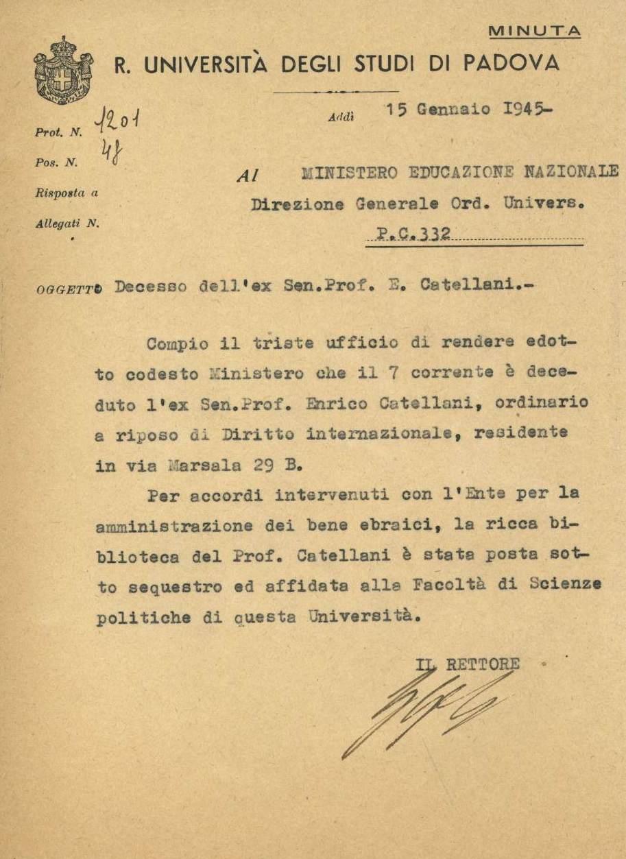 On 15 January 1945, a registered communication signed by the rector of the University of Padova, Giuseppe Gola, informed the Ministry of National Education of the death of Professor Enrico Catellani, stating: “In view of agreements with the Agency for the administration of Jewish property, the vast library of Professor Catellani has been impounded and entrusted to the Faculty of Political Science of this University."