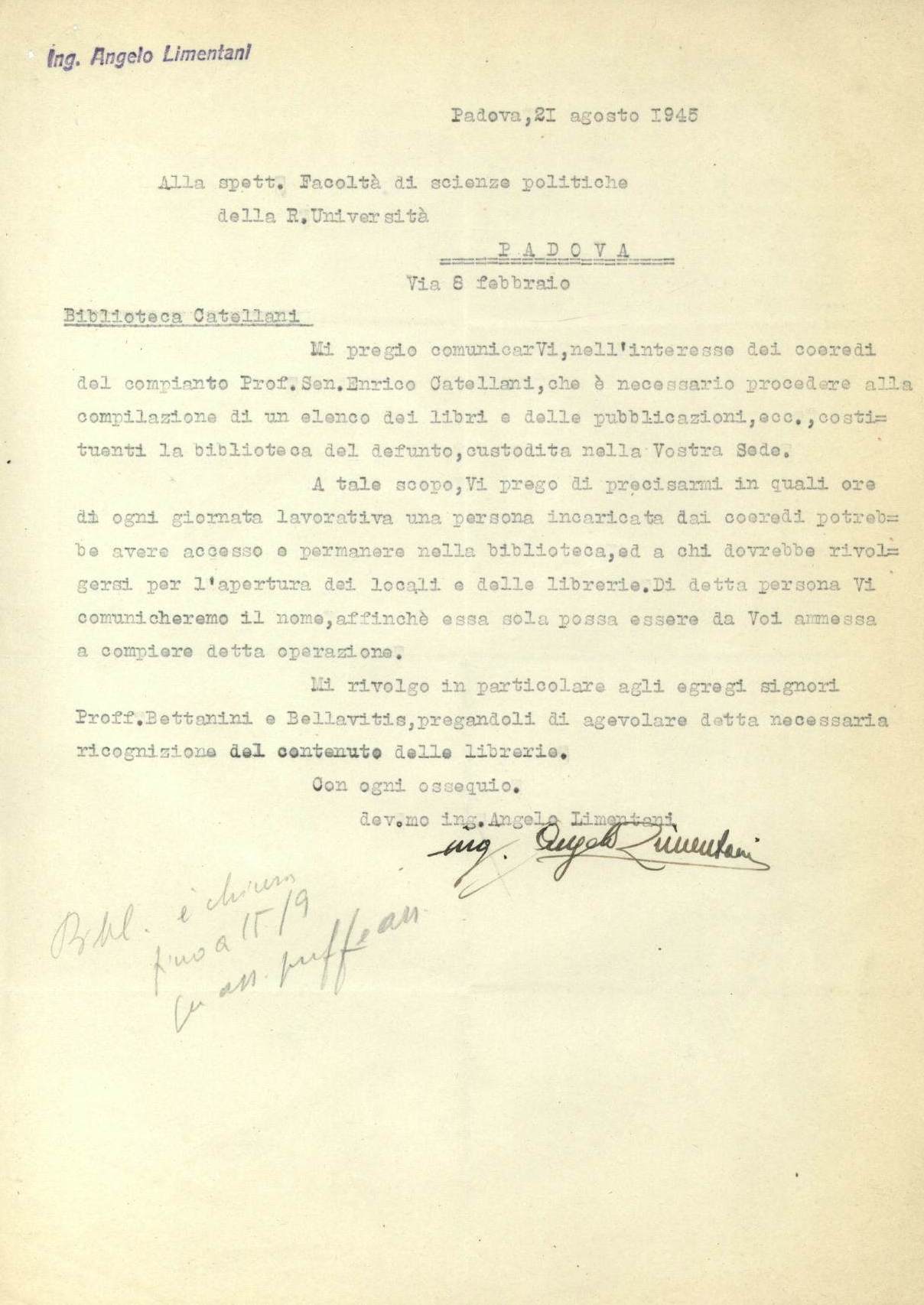 The heirs agreed to the sale of the library and by a letter dated 21 August 1945, Limentani requested a list of books that belonged to the jurist which were in storage at the Facoltà di Scienze Politiche; the heirs would be willing to send one person to make the list.