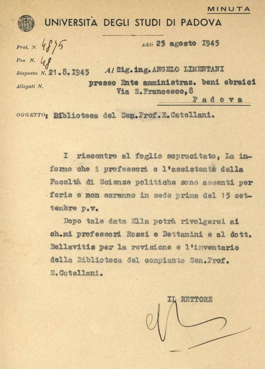 É del 15 gennaio 1945 la minuta protocollata firmata dall'allora rettore dell'Università di Padova Giuseppe Gola, con comunicazione al Ministero Educazione Nazionale del decesso del prof. Enrico Catellani, nella quale: "Per accordi intervenuti con l'Ente per la amministrazione dei beni ebraici, la ricca biblioteca del prof. Catellani, è stata posta sotto sequestro ed affidata alla Facoltà di Scienze politiche di questa Università."