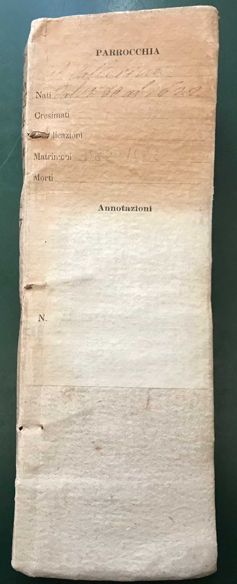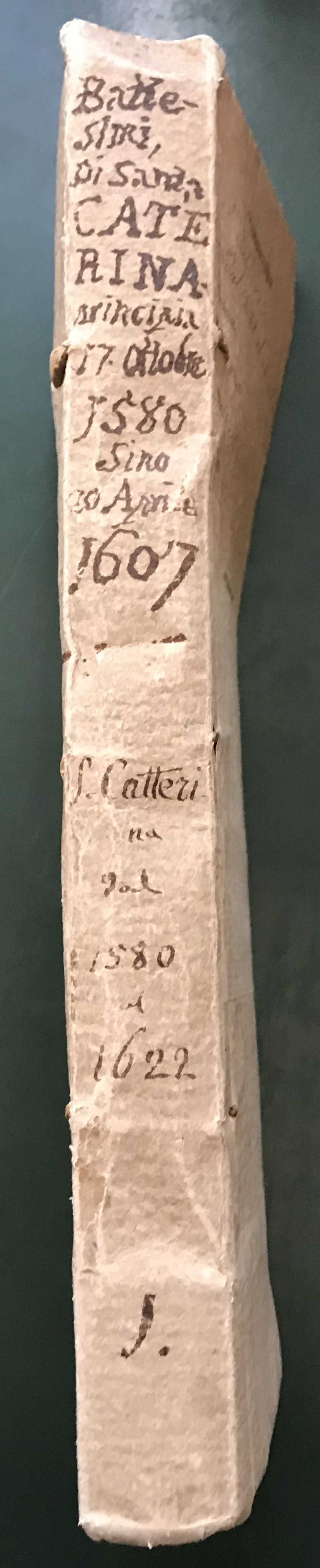 Registro dei battesimi di Santa Caterina dal 17 ottobre 1580 al 30 aprile 1607: dorso, copertina e pagina con l'atto di battesimo di Vincenzo Galilei, in basso a destra (ASDPd, Registri dei battesimi, reg. 1, 22 agosto 1606)