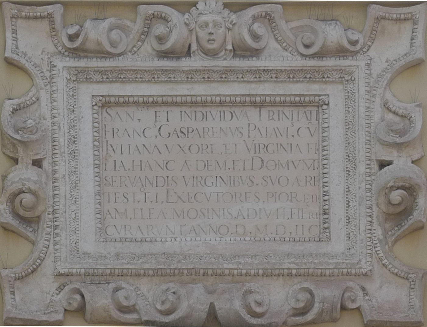 IN ONORE DELLA SANTISSIMA E INDIVISIBILE TRINITÀ, FRANCESCO GASPARINI PADOVANO CON LA MOGLIE GIULIANA E LA FIGLIA VIRGINIA, ORDINÒ NEL SUO TESTAMENTO CHE CON IL SUO PATRIMONIO FOSSERO ISTITUITI QUESTO TEMPIO E CONSERVATORIO PER LA TUTELA DELLE FANCIULLE VERGINI. GLI ESECUTORI SI OCCUPARONO CHE FOSSERO REALIZZATI, ANCHE CON IL RICORSO ALLE ELEMOSINE DEI PII. ANNO DEL SIGNORE 1598.
