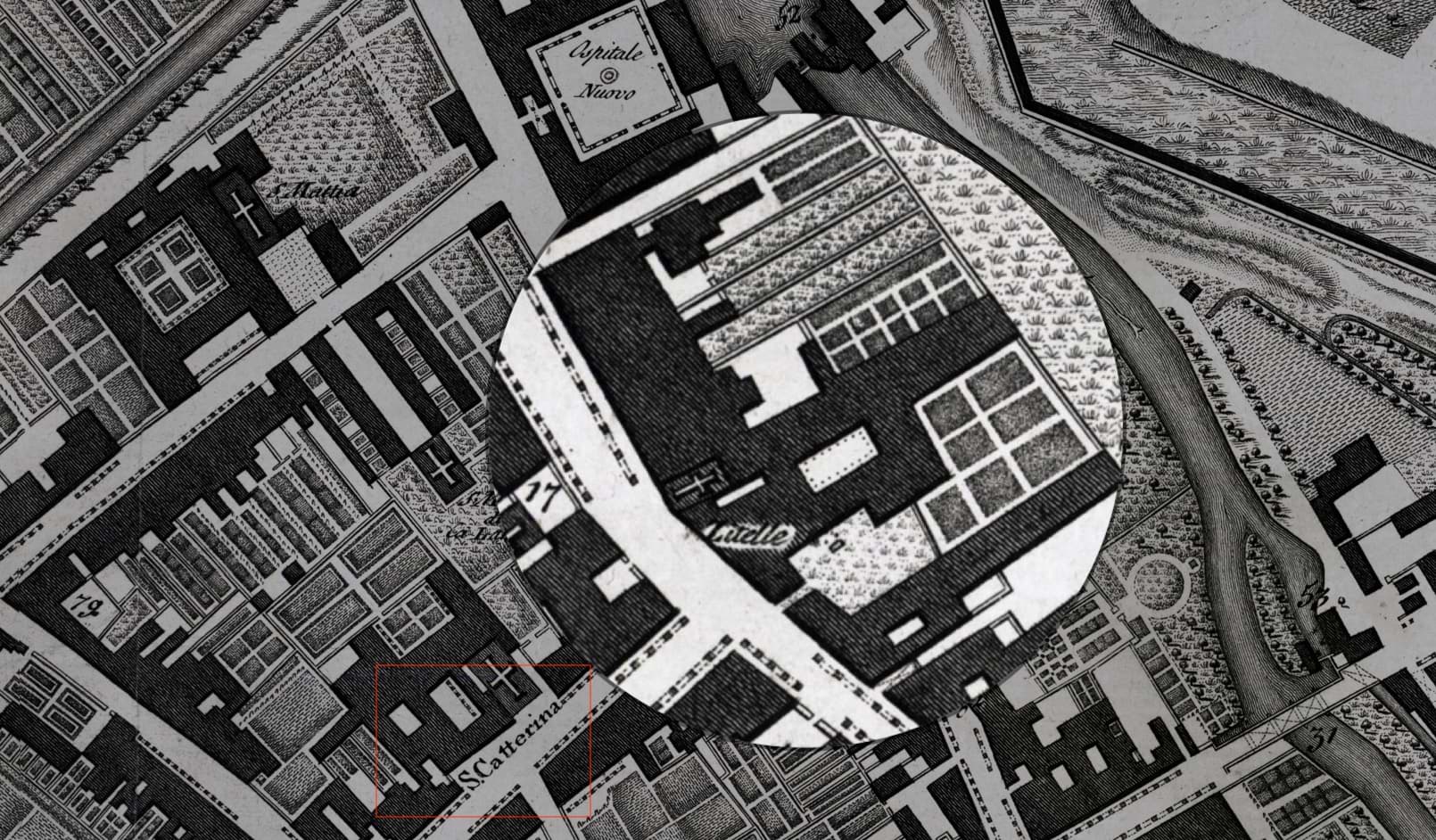 G. Valle, Pianta di Padova (1784), particolare della sede delle Zitelle in rapporto a Santa Caterina, BCPd, RIP.VII.984