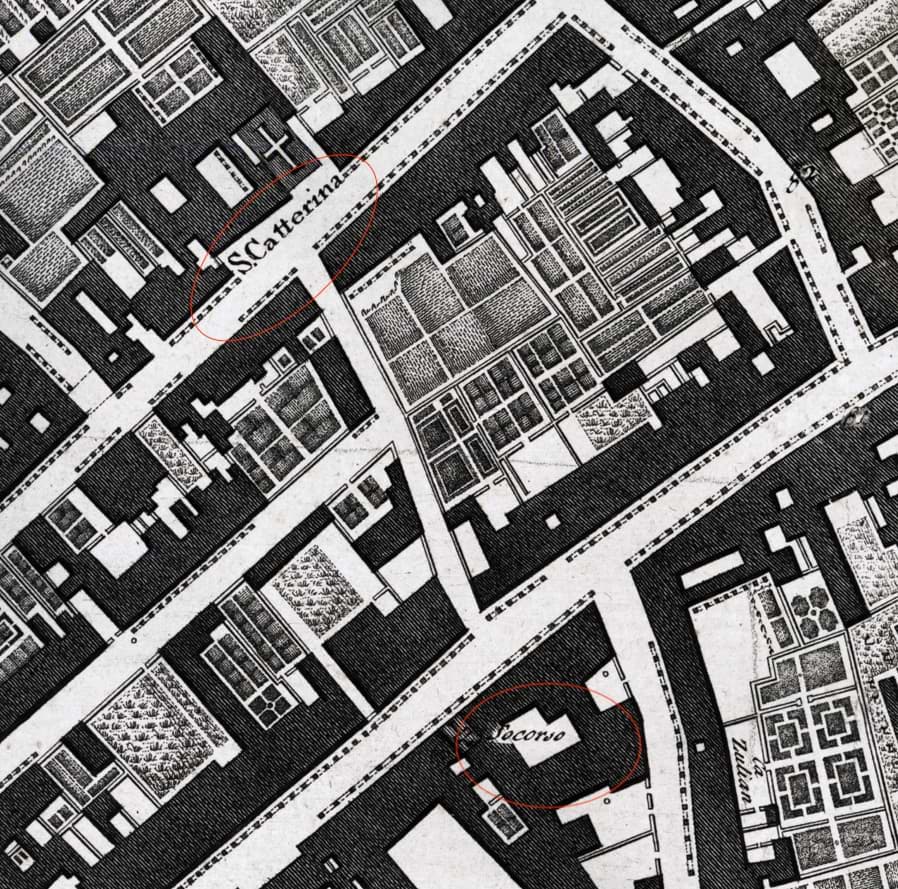 Tra il 1852 e il 1853 fu quindi avviata la costruzione dell'edificio, ad un solo piano, che venne abitato a partire dal maggio del 1854: da quel momento e fino a anni recenti, le sedi dei Conservatori di Santa Caterina e del Soccorso furono riunite in un'unica area che inglobava la chiesa di Santa Caterina su tre lati, come si capisce bene da questa pianta.