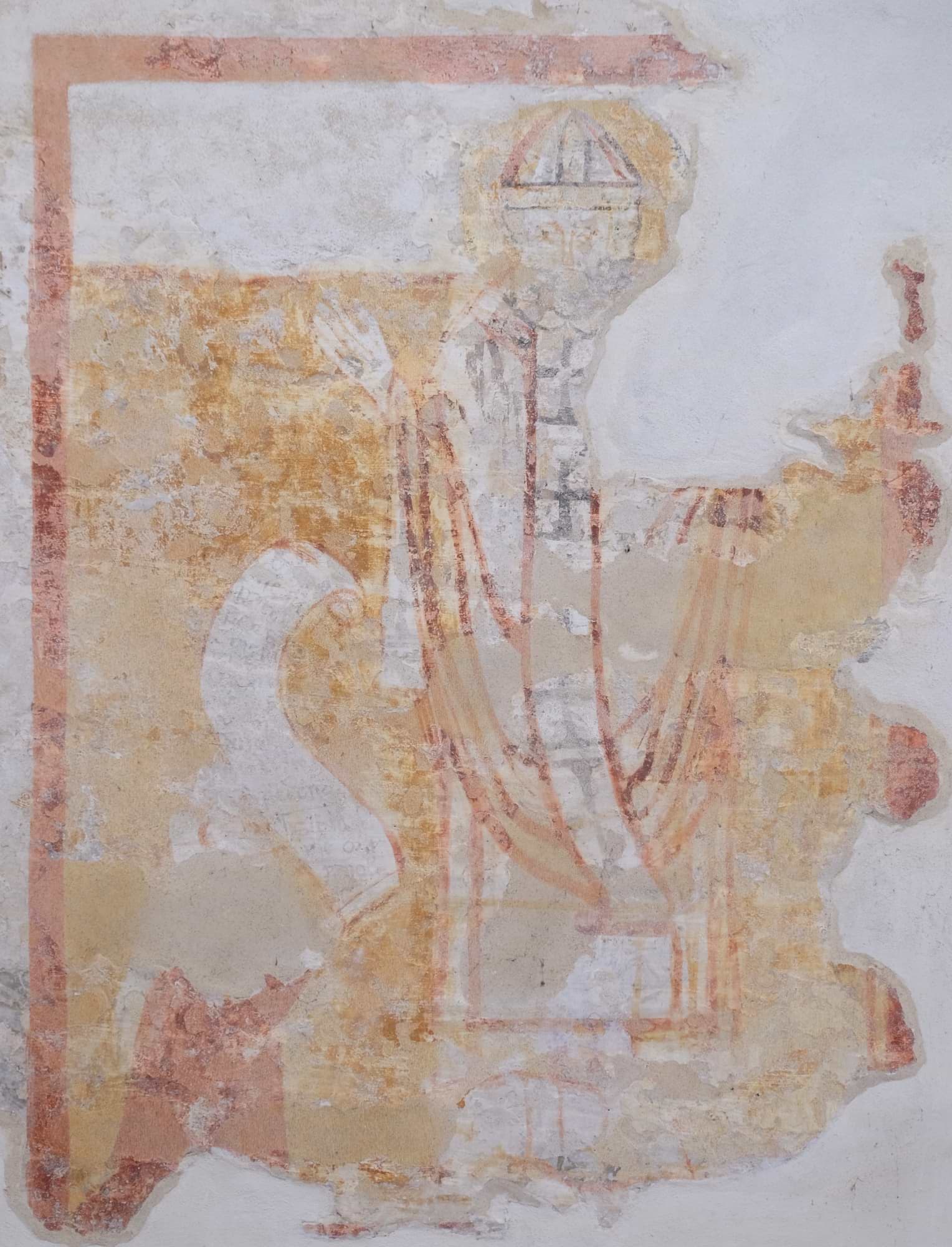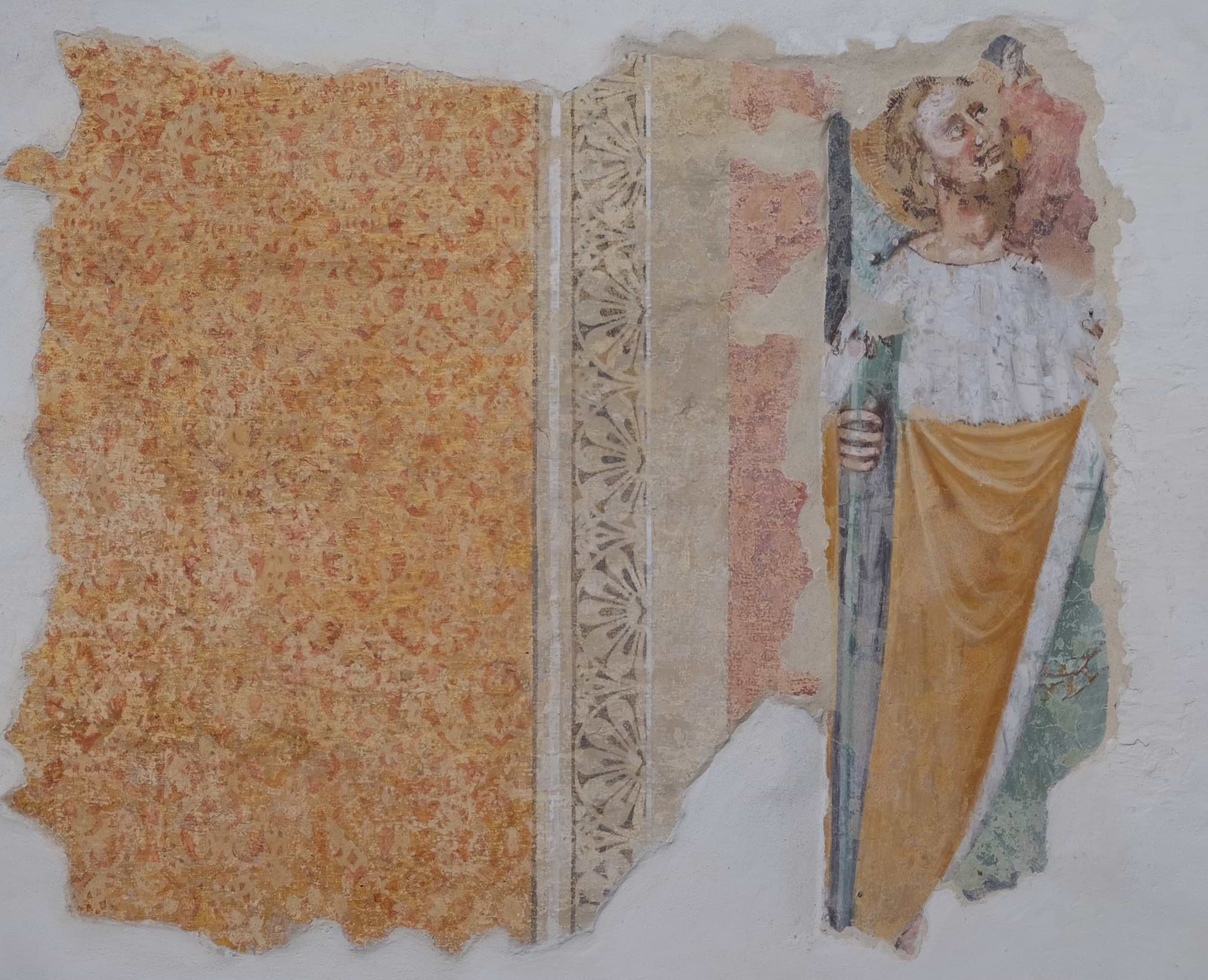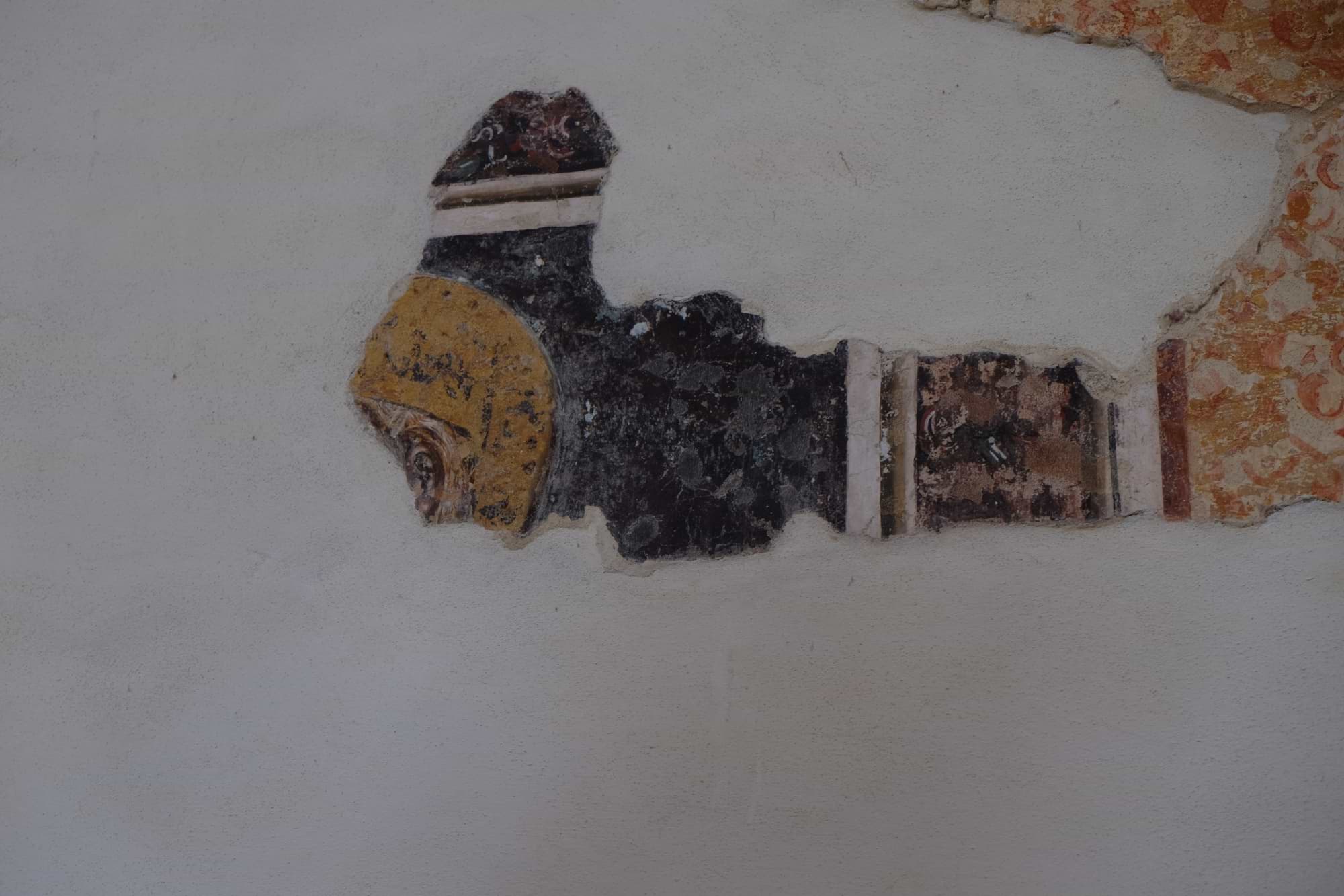 Lungo la stessa parete è un'altra figura di Santo, di cui però non si riesce a indovinare l'identità: la fotografia risulta interessante soprattutto perché permette di comprendere come alla pittura medievale furono sovrammessi nel tempo ulteriori strati d'intonaco, destinati ad accogliere una decorazione di gusto più moderno.