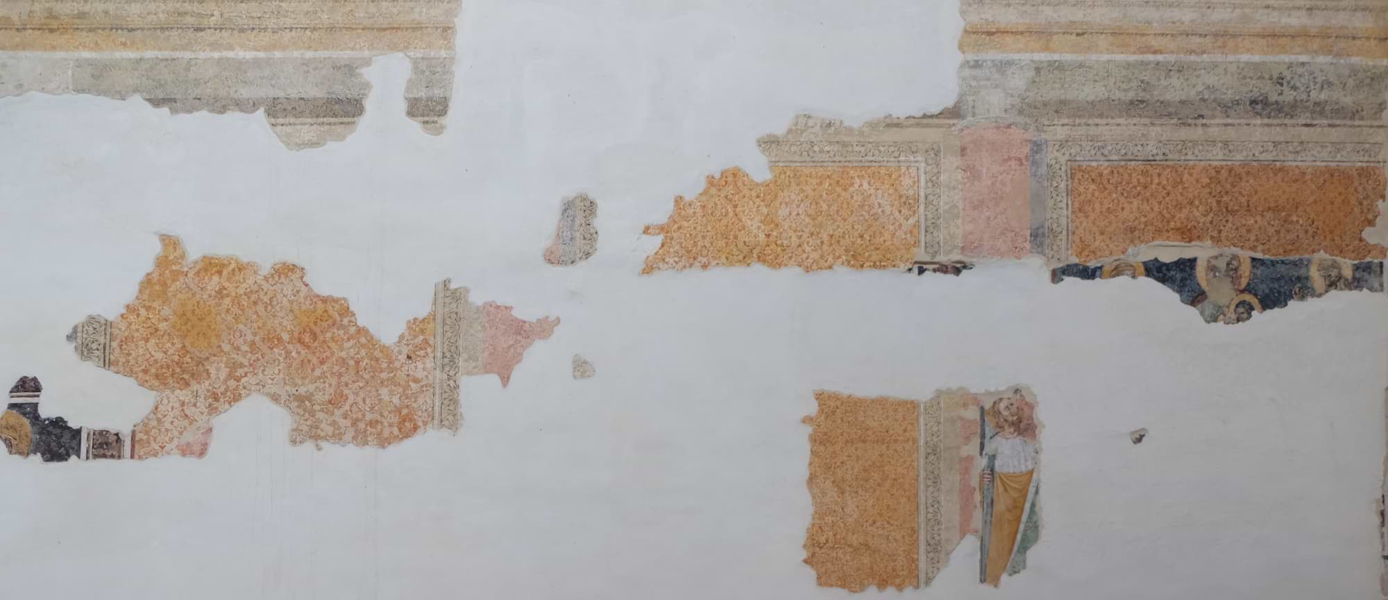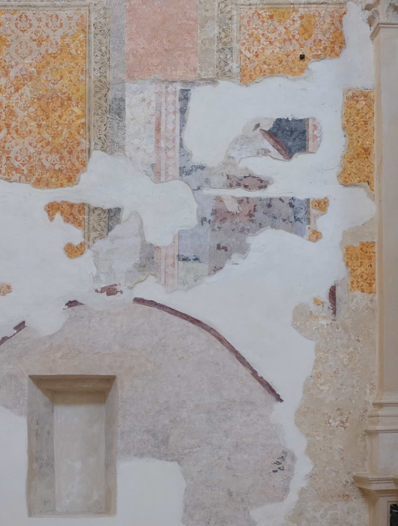 Padova, chiesa di Santa Caterina, parete nord: gli affreschi medievali riscoperti sotto la ridipintura cinquecentesca, che finge un colonnato con tessuti